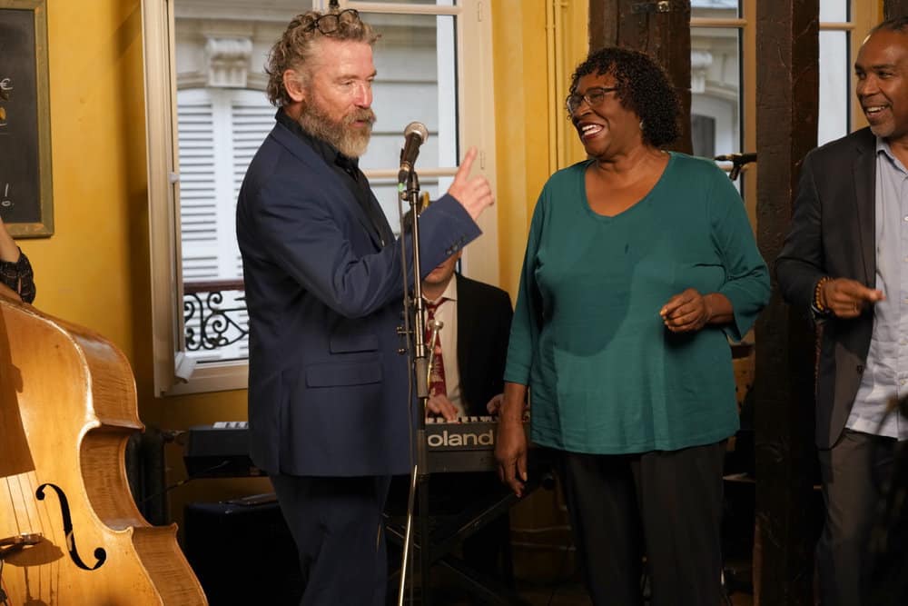 -After dinner, the two of them watch a live jazz show. It is quite good, especially when Doris joins them to perform.